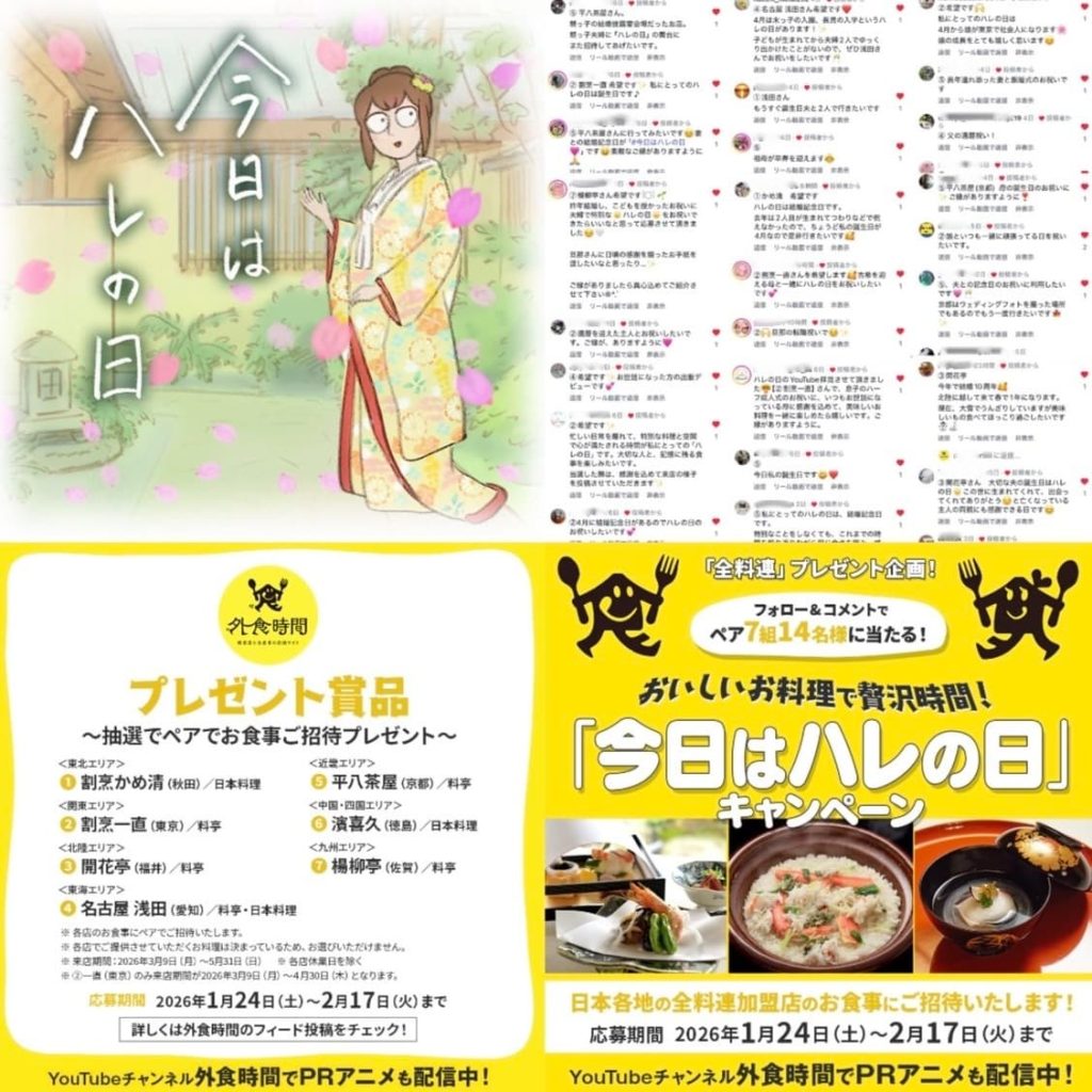 全国料理業生活衛生同業組合連合会(全料連)公式Instagram「外食時間」にて実施した、『今日はハレの日』キャンペーンがこのたび終了いたしました。